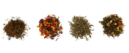 Heap of Earl Grey tea, Jasmine tea, Green tea and peppermint tea isolated on white background; top view