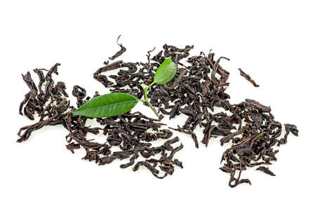Delicious Ceylon, fresh, large leaf black tea on the fingers. Black background. High quality photo