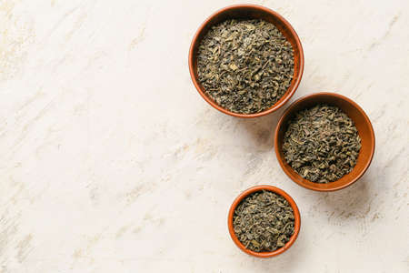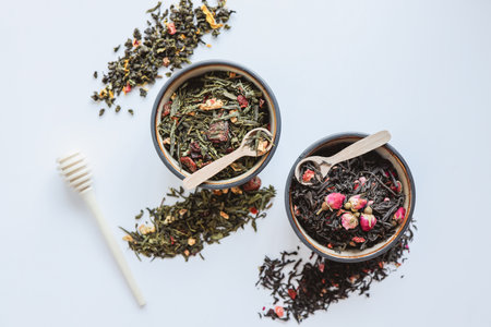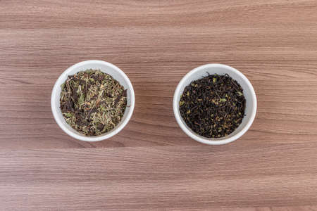 Different types of green, black and herbal tea in a wooden bowl. Variety of dry leaves and flowers. Organic high-quality ingredients for a drink. Soft focus on one bowl