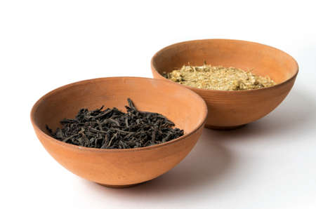 Herbal tea leaves prepared for a cooking in a white plate on a wooden background