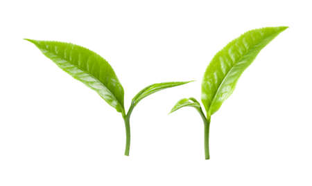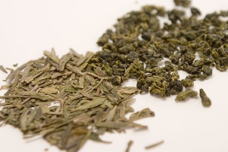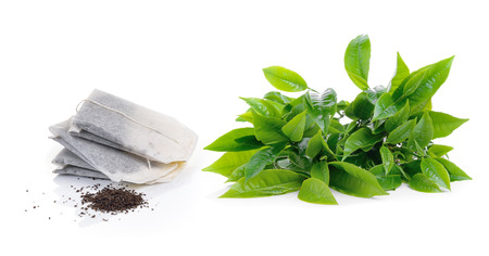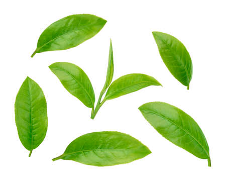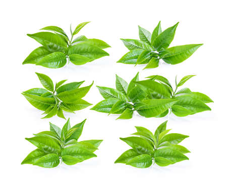 different types of fresh raw green tea leaf flower bud black brown tea powder on white background