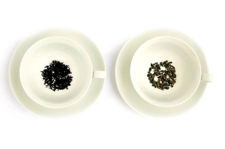 Herbal leaf dried tea and cups with drink, top view on white background.