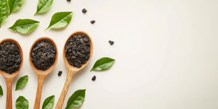 Types of tea in a cup and leaves, healing tonic drink, black background isolate. Header banner mockup with copy space. AI generated.