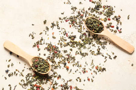 Different types of green, black and herbal tea in a wooden bowl. Variety of dry leaves and flowers. Organic high-quality ingredients for a drink