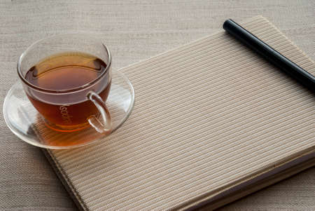 Tea and pens placed on a notebook for work