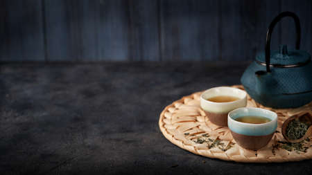Asian food background banner with green tea, cups and teapot with leaves and free space for text on dark background.