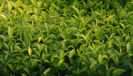 Sunlit tea shoots in an expansive tea plantation