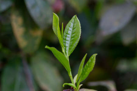 Closeup, Top of Green tea leaf in the morning, tea plantation, blurred background. A leaf of Chinese camellia, from which green and black tea are made