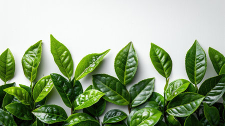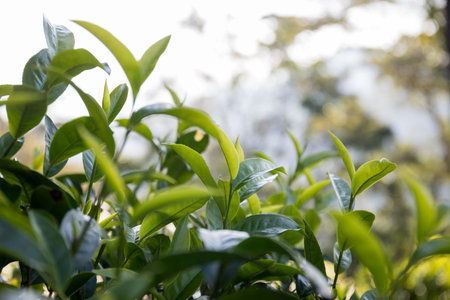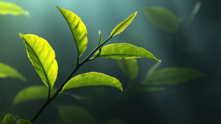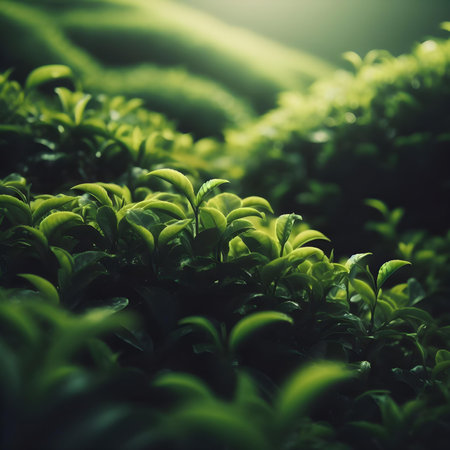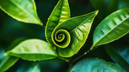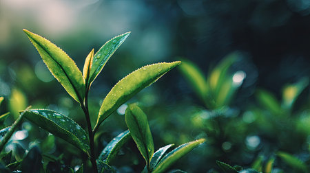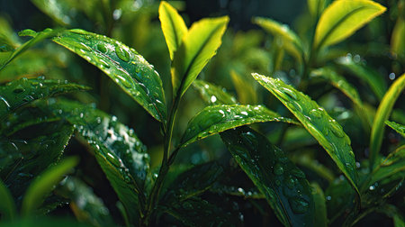 Fresh green tea leaves display vibrant array of textures and shades, showcasing their natural beauty and vitality. lush foliage creates serene and calming atmosphere, perfect for nature lovers