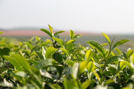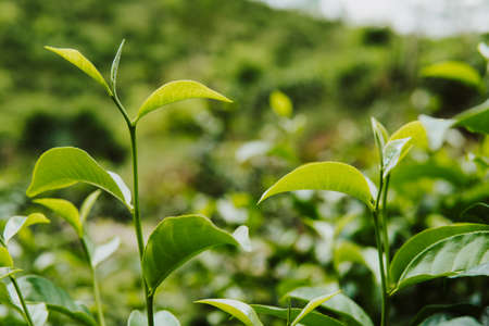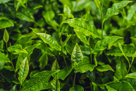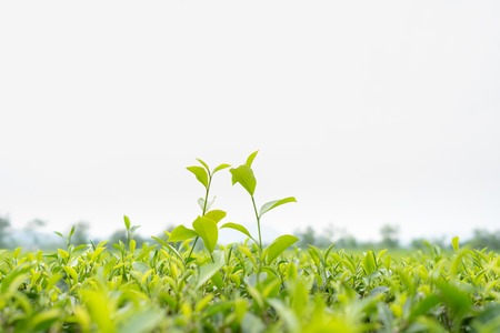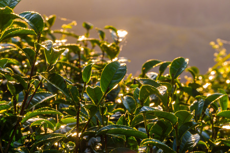 Green tea leaves in a tea plantation in morning, Tea plantations at dawn.