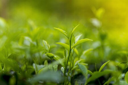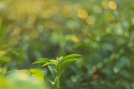 Fresh shoots of tea leaves in the tea plantation with sunlight in the morning.