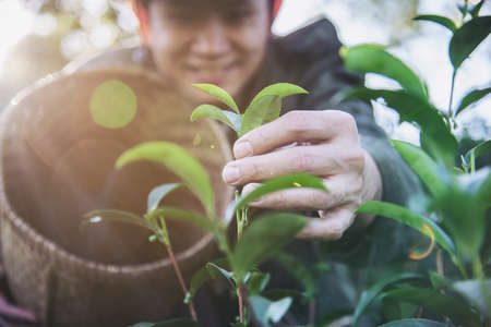 Man harvest / pick fresh green tea leaves at high land tea field in Chiang Mai Thailand - local people with agriculture in high land nature concept