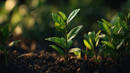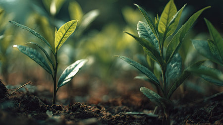 Camellia sinensis with small fresh leaves, growing upright in fertile soil, sunlight filtering gently, realistic textures, vibrant green tones, natural photography style, wide balanced composition