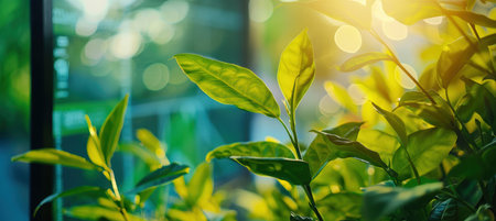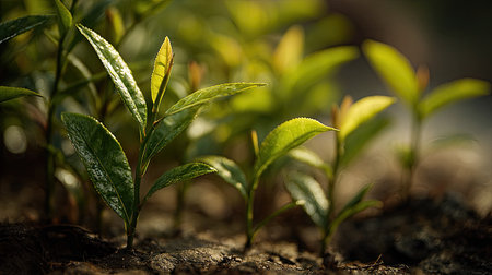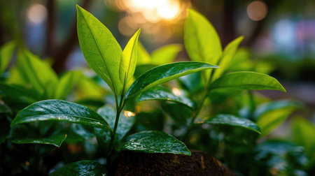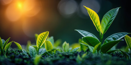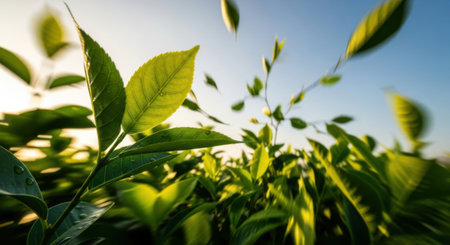 A close-up view of vibrant green tea leaves illuminated by natural sunlight, showcasing the lush beauty of nature and the freshness of organic growth in a serene environment.