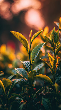 This vibrant image captures fresh green tea leaves with a warm sunrise illuminating a lush tea plantation. The scene exudes tranquility and natural beauty.