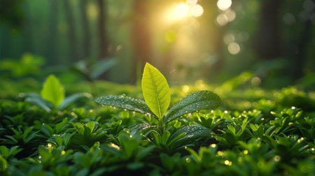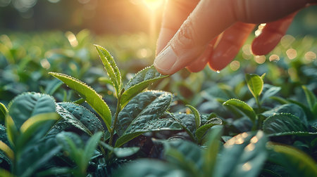 Delicate green tea leaves, freshly picked and adorned with morning dew, create a vivid tapestry in a lush plantation, highlighting nature's beauty at sunrise.