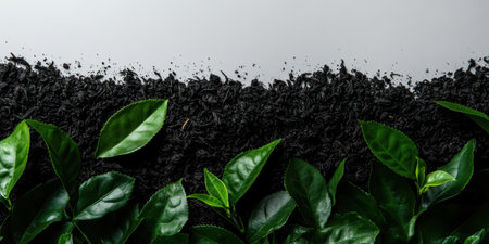 Scattered ground tea leaves form a textured layer on a pristine white surface, while vibrant green tea leaves peek through, adding contrast and freshness to the composition.