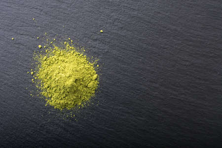 Powder matcha tea in the shape heart on a dark background. Top view.