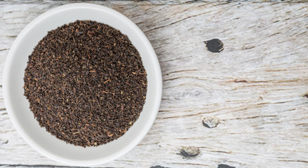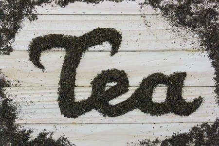 The word tea is laid out on a light-brown wooden Board small leaf black tea. Board is the background. The edges lined with a frame of tea.