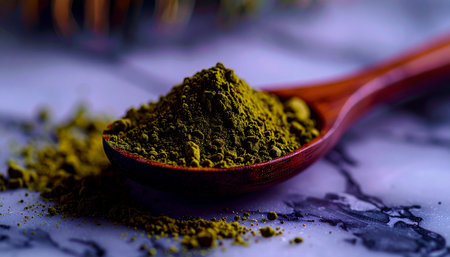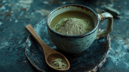 A serene image showcasing a rustic cup filled with herbal powder beside a spoon. The warm beverage on a textured surface invites a moment of calm and wellness.