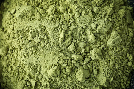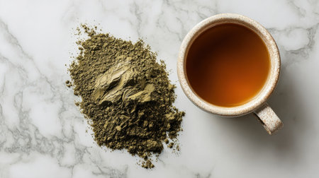 A freshly brewed cup of herbal tea sits next to a pile of green herbal powder on a smooth marble surface, showing natural ingredients for wellness.