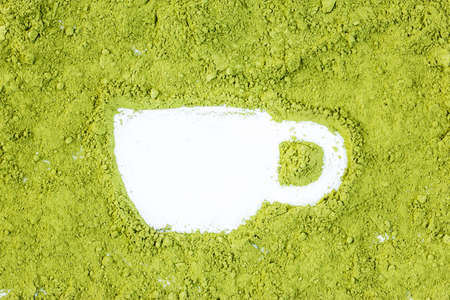 Powdered green matcha tea on a white isolated background close-up. Texture of matcha tea macro background. Copy space. Top view. Flat lay.