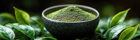 Matcha powder in a bowl surrounded by fresh tea leaves, natural lighting