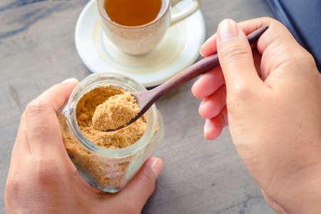 A woman holds in her hands a jar filled with fragrant natural cocoa powder, which she takes out with a teaspoon. The process of making a delicious invigorating pleasant drink for breakfast.