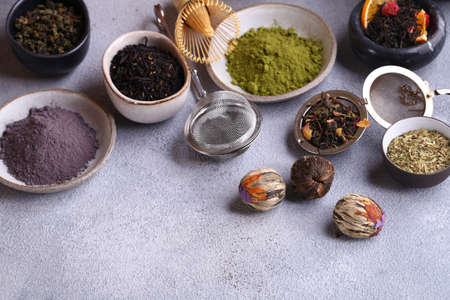 Selection of fragrant teas with dried fruits and spices in teaspoons, that a dark background, top view, copy space