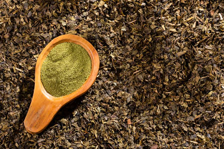 Vibrant matcha green tea powder and leaves isolated on beige background.