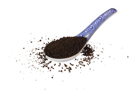 Spoon holding steaming black loose leaf tea against minimalist background.