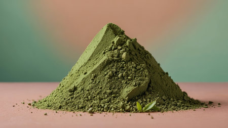Mockup of matcha tea powder with leaves on a beige background, providing a warm and inviting backdrop for your creative projects.
