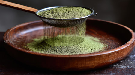 A vibrant green tea powder is carefully sifted into a rustic wooden bowl, showcasing the process of preparing a healthy beverage in a kitchen setting.
