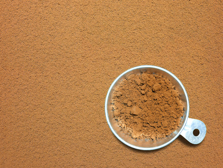 There is a silver teaspoon with patterns in a jar with delicious fragrant crumbly cocoa powder. An invigorating delicious drink in the morning. Top view.