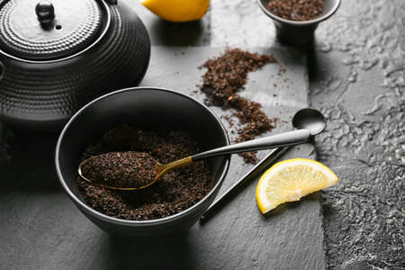 Loose black tea with few dried flowers on yellow board, view from above space for text right side