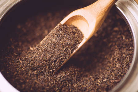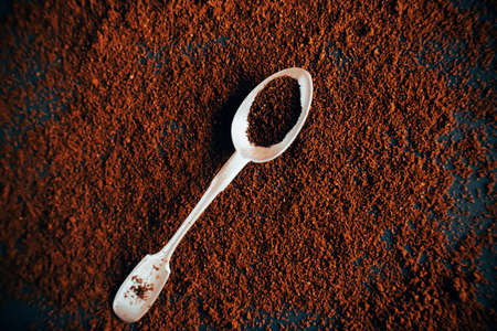 A beautiful silver teaspoon with a portion of ground coffee in it lies against a background of scattered fragrant coffee. Instant coffee in the morning. An invigorating drink that gives energy.