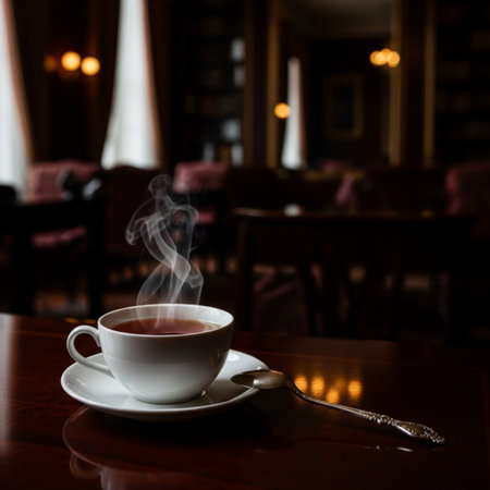 A delicate floral teacup filled with tea on a saucer in a cozy cafe setting