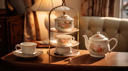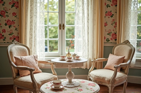Vintage floral tea room with elegant pink rose decor and classic china set. That the image is generated using AI.