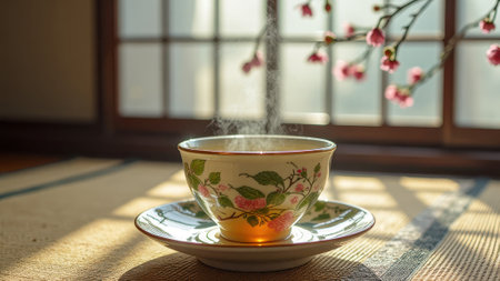 Steaming floral teacup in traditional Japanese room with cherry blossoms. That the image is generated using AI.