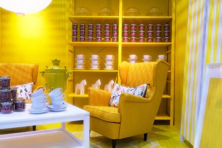 An old samovar on the table. Modern table on a yellow background. Kitchen in a modern style. Kitchen furniture and dishes on the table. Rustic style