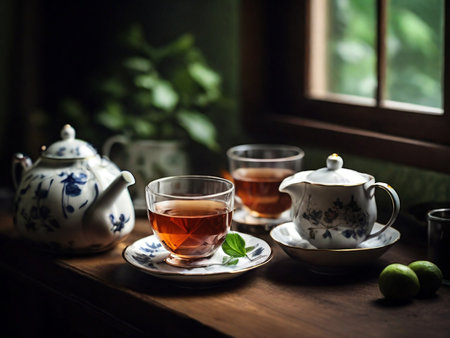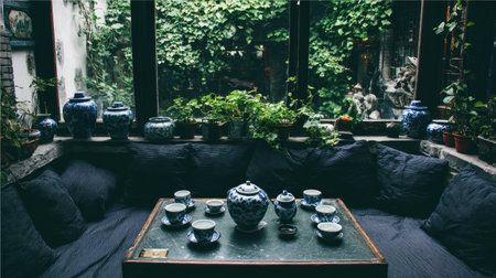 A tranquil interior scene showcases a tea set arranged on a square table. The composition includes blue and white porcelain items. Soft light illuminates the room, which has a large window framing greenery. This image could be used for lifestyle, culinary, or interior design projects.