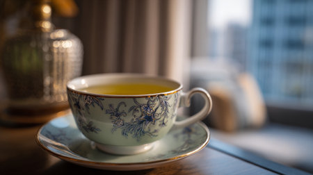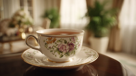 A delicate floral teacup filled with tea on a saucer in a cozy room
