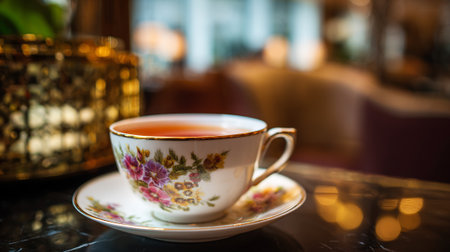 A delicate floral teacup filled with tea on a marble table in a cozy cafe