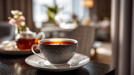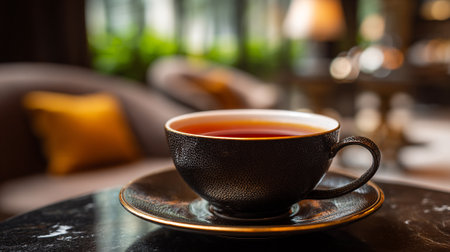 A delicate tea cup on a saucer sitting on a marble table in a cozy room
