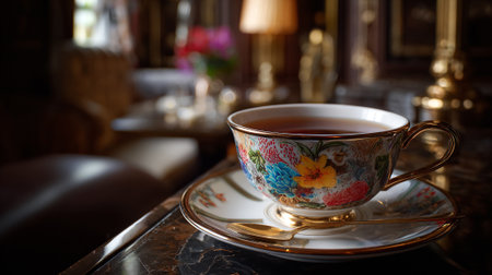 A delicate floral teacup and saucer on a marble table in a luxurious room