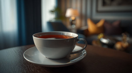 A cup of tea on a table in a cozy living room with a blurred background