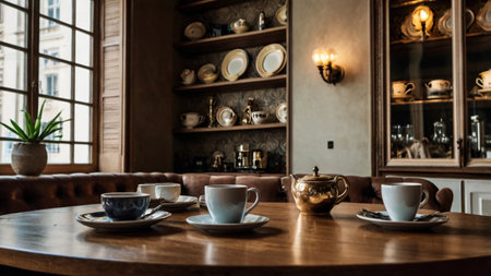 Vintage floral dining room with sunlit tea setting and elegant china cups. That the image is generated using AI.
