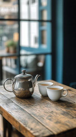 Two delicate cups filled with amber tea sit on a rustic wooden table alongside an elegant silver teapot. Natural light highlights this cozy tea setup.