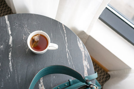 A delicate tea cup and saucer on a marble table in a cozy cafe setting