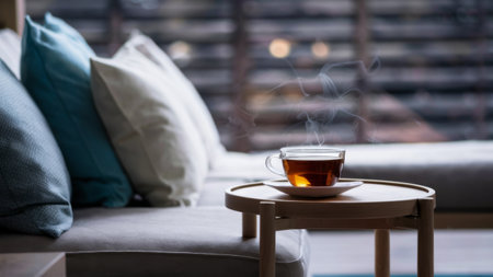 A cup of tea on a table next to pillows and couch, AI
